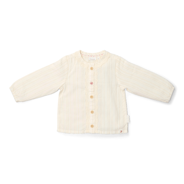 Lass dein Kleines mit dieser festlichen Bluse strahlen. Diese Bluse ist aus 100% Bio-Baumwolle gefertigt und hat glitzernde Lurexfäden für einen funkelnden Look. Süße Rüschen am Halsausschnitt und Verschluss verleihen eine verspielte Note, während charmante Holzoptik-Knöpfe und der einzigartige blumenförmige Knopf der Bluse einen besonderen Akzent verleihen. Perfekt für jeden besonderen Anlass! Erhältlich in den Größen 74 bis 104.