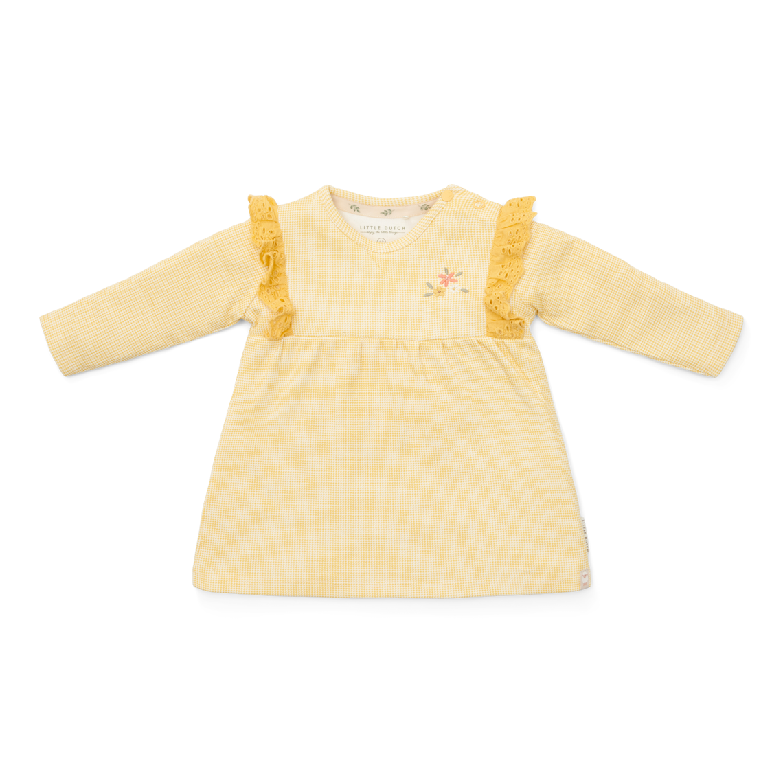 Fröhliche Karos! Der warme, gelb karierte Allover-Druck dieses entzückenden Kleides verschönert jeden Tag mit seinem sonnigen Charme. Das charmante Design mit süßen Rüschen an den Schultern und zarten Broderie-Anglaise-Details verleiht dem Kleid eine verspielte und zugleich elegante Note. Dieses Kleid aus Baumwolle (Bio) umhüllt Ihr Kind mit Weichheit und Stil und sorgt den ganzen Tag über für Komfort. Es lässt sich mühelos mit allen Teilen der koordinierten Little Farm-Kollektion mischen und kombinieren. Erhältlich in den Größen 44, 50, 56, 62, 68 und 74. Waschanleitung: Maschinenwäsche bei 30°C im Schonwaschgang, bei niedriger Temperatur auf links bügeln, nicht chemisch reinigen, nicht bleichen, nicht im Trockner trocknen Farbe: Gelb Material: 100% Baumwolle (Bio)