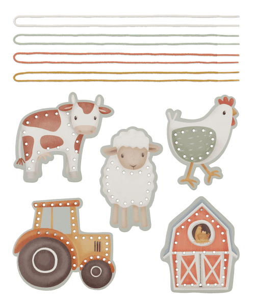 Set mit 5 Little Dutch Fädelkarten aus der Little Farm-Serie mit Bildern einer Kuh, eines Schafs, eines Traktors und mehr. inkl. Faden in verschiedenen Farben