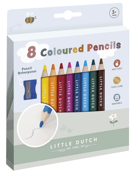 Little DutchHolzfarbstifte. Set mit 8 Farben, die Buntstifte sind kurz und dick für einfachen Griff. Inklusive Spezialspitzer