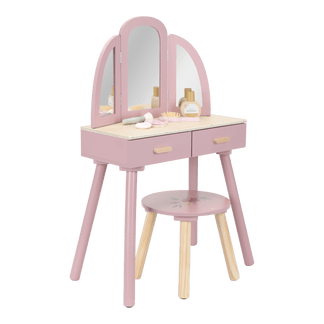Fühle dich wie eine echte Prinzessin mit diesem wunderschönen rosa Frisiertisch aus Holz! Der elegante dreiteilige Spiegel ermöglicht es deinem Kind, sich aus allen Blickwinkeln zu betrachten, während die geräumigen Schubladen Platz für alle schönen Accessoires bieten. Inklusive sechs Holz-Schönheitsprodukten und einem charmanten Hocker mit Blumenillustration. Perfekt für fantasievolles Spielen und das Nachahmen der Erwachsenen!