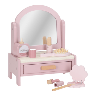 Stelle deine schönsten Accessoires bereit und setz dich vor den Spiegel! Dieser wunderschöne Holz-Frisiertisch hat einen drehbaren Spiegel und wird mit sechs stilvollen Schönheitsprodukten geliefert, wie einer Haarbürste, Lippenstift und Parfüm. Perfekt für kleine Beauty-Liebhaber, die sich gerne verkleiden und stylen. Lass der Fantasie freien Lauf!