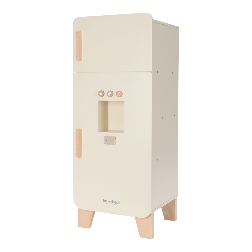 Die Türen können geöffnet werden, er hat eine funktionierende Eiswürfelmaschine mit Holzeiswürfeln, die Knöpfe können gedrückt werden.