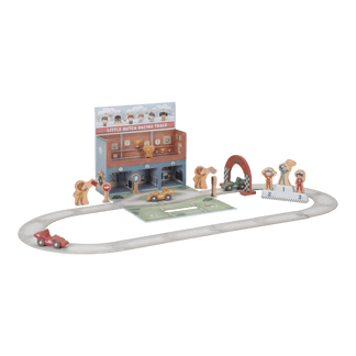 Startet die Motoren! Dieser Kartonkoffer verwandelt sich in eine komplette Rennstrecke. Das Set enthält alles, was du für ein spannendes Rennen brauchst: Rennwagen, Rennfahrer, eine Ziellinie, Verkehrsschilder, eine Trophäe und ein Siegerpodest. Die Karton-Rennstrecke besteht aus einzelnen Teilen, die wie ein Puzzle leicht zusammengebaut werden können. Nach dem Rennen lässt sich alles einfach im Koffer verstauen. Bereit für das nächste Rennen?