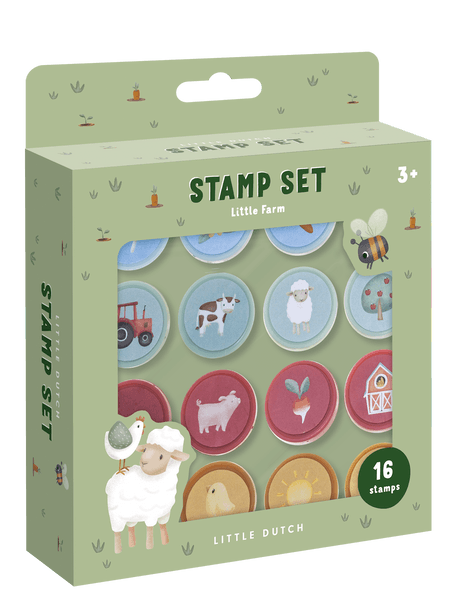 Stempelset Little Farm, enthält 16 selbstfärbende Stempfel pro Packung mit Bauernhoftieren und bäuerlichen Motiven.