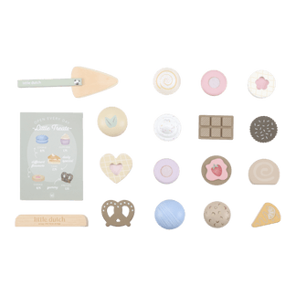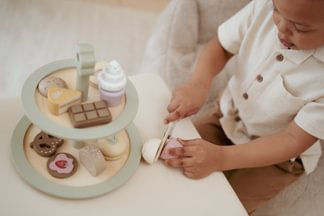 Teezeit! Mit dieser wunderschönen Holz-Etagere voller köstlicher Leckereien können Kinder eine fantastische High Tea servieren. Auf den drei Etagen findest du einen Muffin, Kekse und bunte Macarons – alle gleichermaßen verlockend. Nutze das mitgelieferte Tortenheberchen und die Menükarte mit Illustrationen, damit die Gäste ihre Wahl treffen können. Perfekt für fantasievolles Spielen und gemütliche Teemomente!