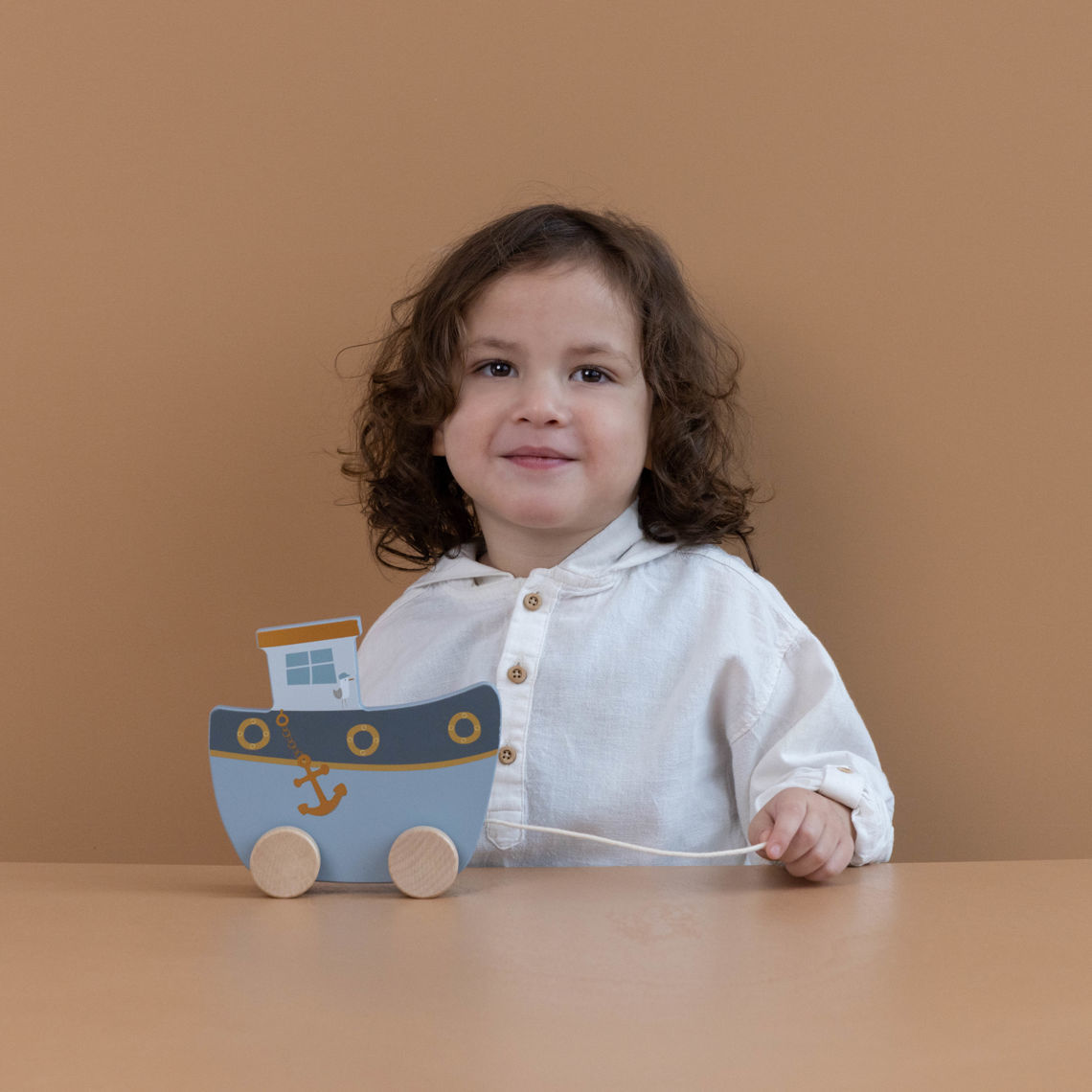 Gehen Sie gemeinsam mit dem Holz Nachzieh Boot von Little Dutch auf Tour. Ziehen Sie das schöne Boot am Seil und er schaukelt fröhlich mit Ihnen mit.