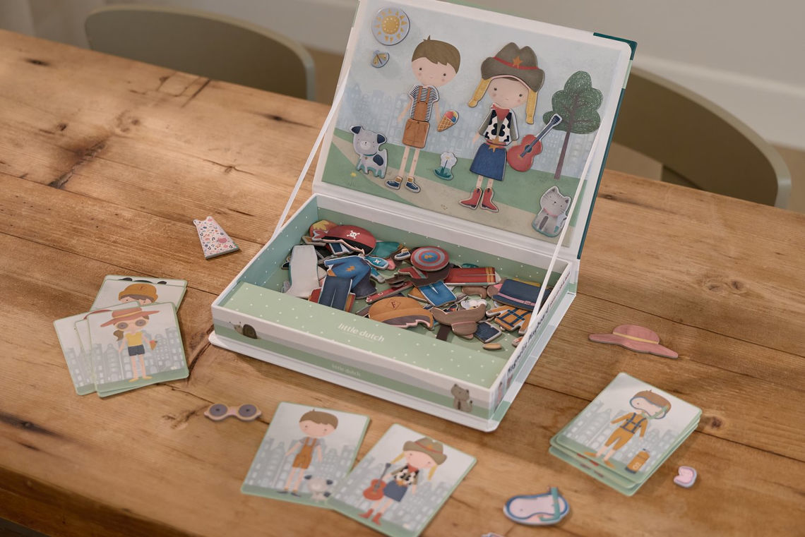Zieh dich schick an mit Jim & Rosa! Mit diesem Magnetpuzzle kannst du das Outfit, dass auf dem Spielbrett gezeigt wird mit Magnetstücken nachmachen, oder gebrauche deine eigene Fantasie! Es gibt endlose Kombinationen, die Spaß zuhause, aber auch unterwegs garantieren und den Wortschatz und die Koordination des Kindes fördern. Dieses Magnetpuzzle besteht aus 80 kleinen Magneten, 6 Karten für Rosa und 6 für Jim. Die Schachtel besteht aus stabilem Karton zur einfachen Aufbewahrung aller Teile. Der Magnetdeckel kann als Spielbrett verwendet werden. Vorraussichtlicher Liefertermin: Oktober 2020